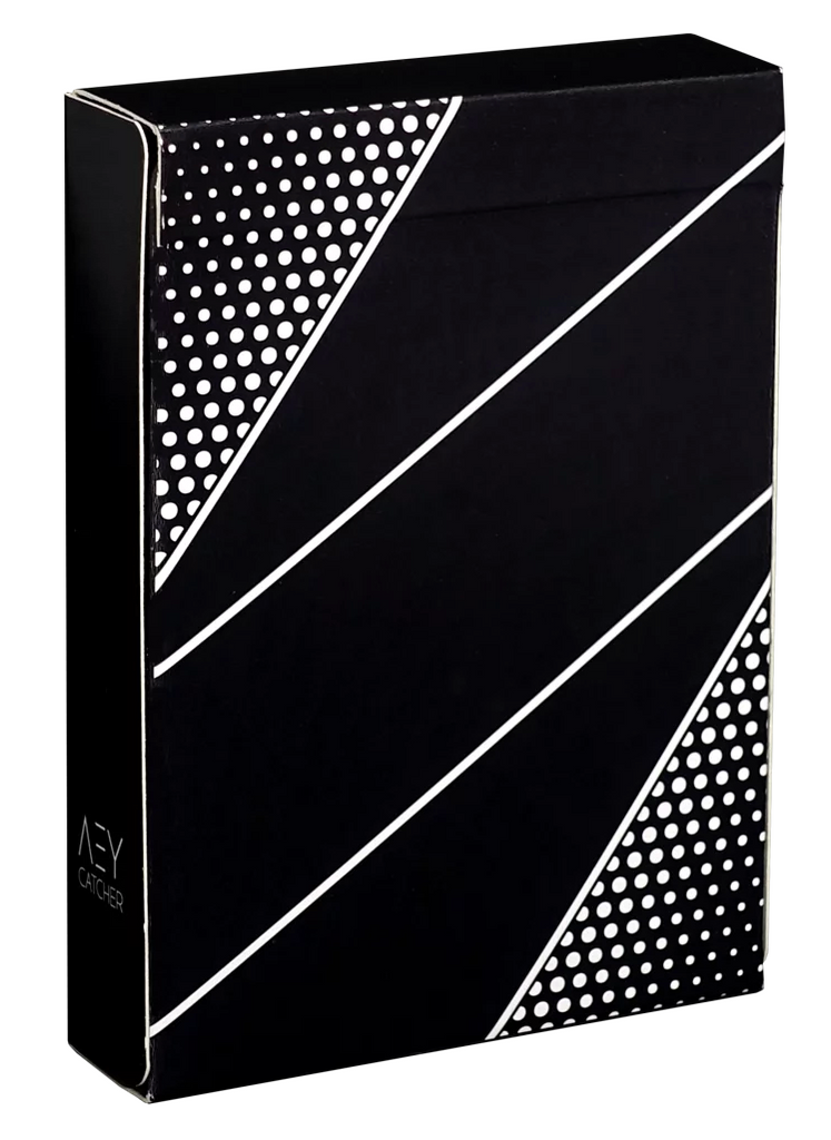 The tuck case represents the back of cards, is all done in a black color with 2 white lines crossing in the center and white dots in the upper-left and bottom-right corners. One side of the case has the AEY Catcher logo and the other one has the hashtag #aeycatcher on it.