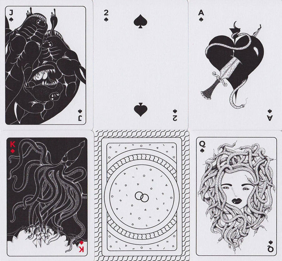 The court cards feature detailed, hand-drawn illustrations based on mythical creatures like the Kraken and a Nymph, and ancient gods, such as Triton and Medusa.