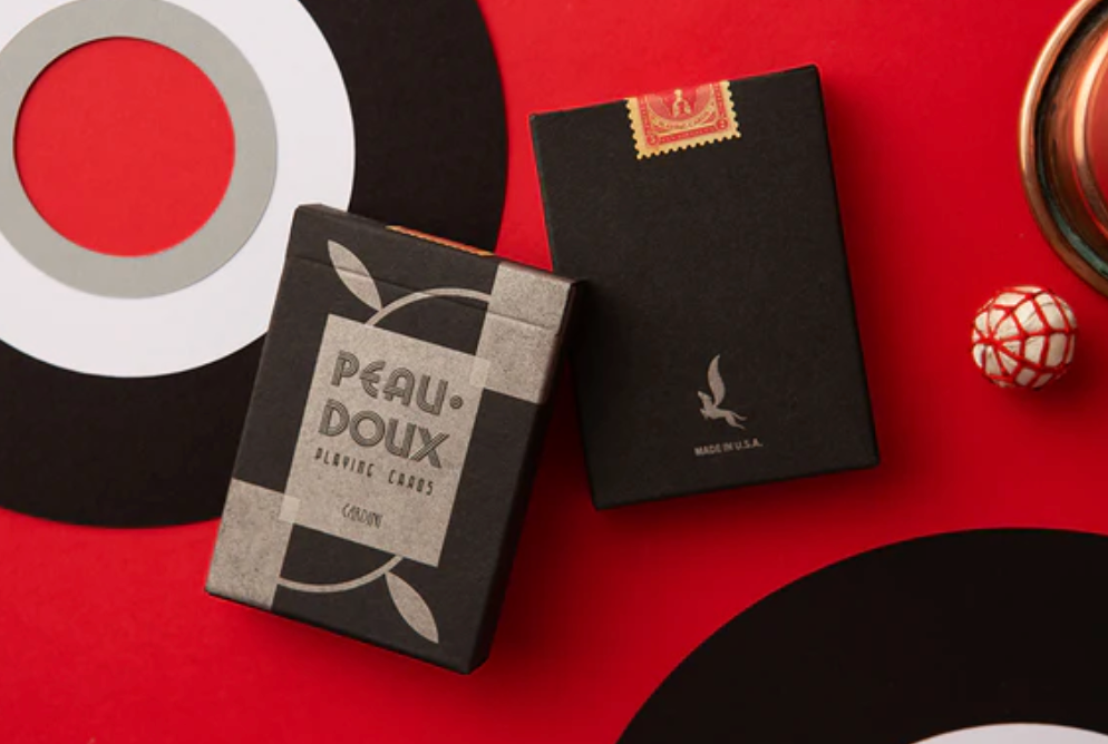 This deck is a modern poker-sized replica of the special Peau Doux playing cards Cardini used in performance of his legendary nightclub act "The Suave Deceiver." Special features include a vintage-inspired tuck box, letterpress-printed with silver metallic ink and embossed typography. Custom tax stamp, ace of spades, and matching jokers depicting a silhouette of Cardini illustrated by Wade J. Callender.